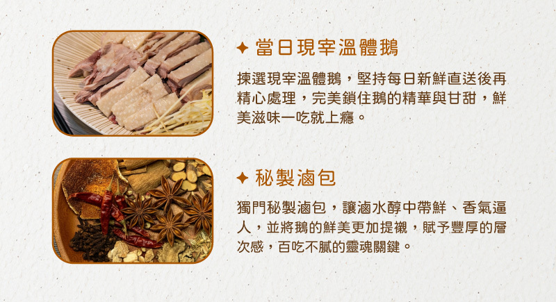 ‧ 堅持使用當日現宰溫體鵝,鎖住精華與甘甜