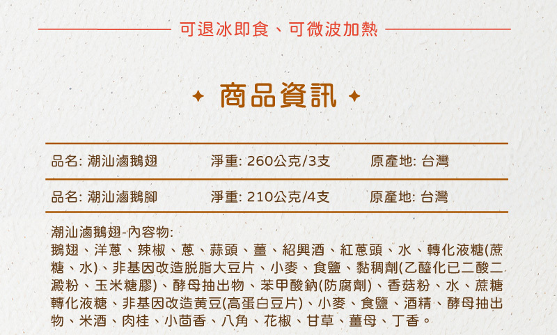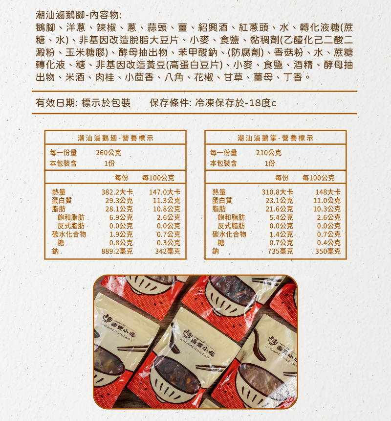 ‧ 鵝翅-260公克/包,共三支;鵝腳-210公克/包,共四支