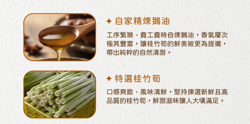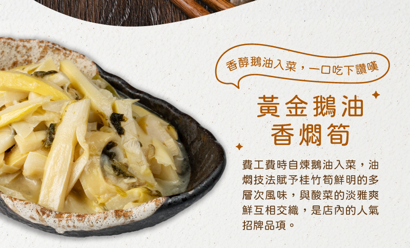 ‧ 厚工精煉鵝油,襯出桂竹筍的自然鮮甜