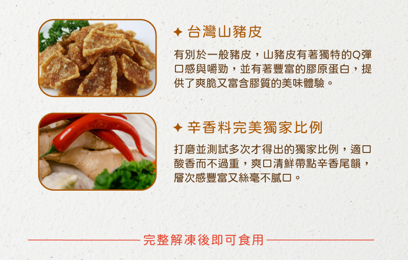 ‧ 揀選台灣山豬皮,爽脆又富含膠原蛋白